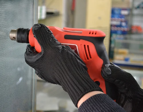 Full finger,tremor-low gloves,7 gauge black nylon seamless knitted with anti-vibration palm & anti-impact latex foam coating.