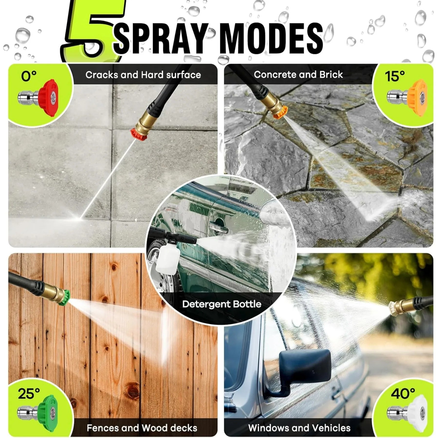 【MULTI-FUNCTIONAL USE】The Power Washer is equipped with four quick-connect metal spray nozzles (water-pressure strength:0°>15°> 25°> 40°) and a foam cannon. 4 metal nozzles with different pressure strengths for different application scenarios to meet your cleaning needs. The detergent bottle can be filled with chemicals such as bleach, the cleaner will not pass through the pump, so you don't have to worry about cleaning the machine.