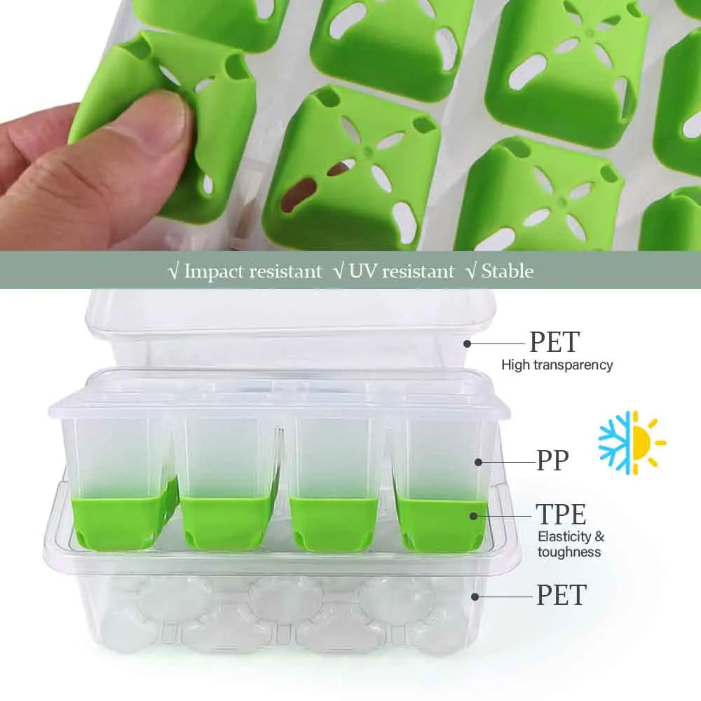 🌱  High-Quality Materials: The colored base of the seed tray is made from flexible and durable TPE material, which ensures long-term use and ease of handling. The semi-transparent tray is crafted from PP material, while the cover and water tray are made from PET, providing high transparency for easy observation of seedling growth. The kit includes 12 flexible pop-out cells made of TPE, which protect seedlings and minimize root damage during transplanting.